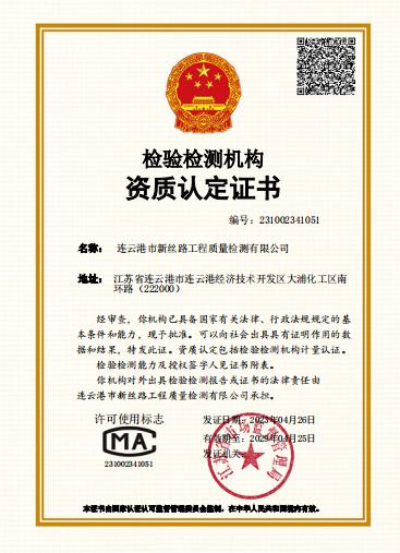 近日,江蘇海建新絲路檢測(cè)公司申報(bào)的檢驗(yàn)檢測(cè)機(jī)構(gòu)資質(zhì)認(rèn)定,經(jīng)江蘇省市場(chǎng)監(jiān)督管理局核準(zhǔn),換證成功并取得證書。