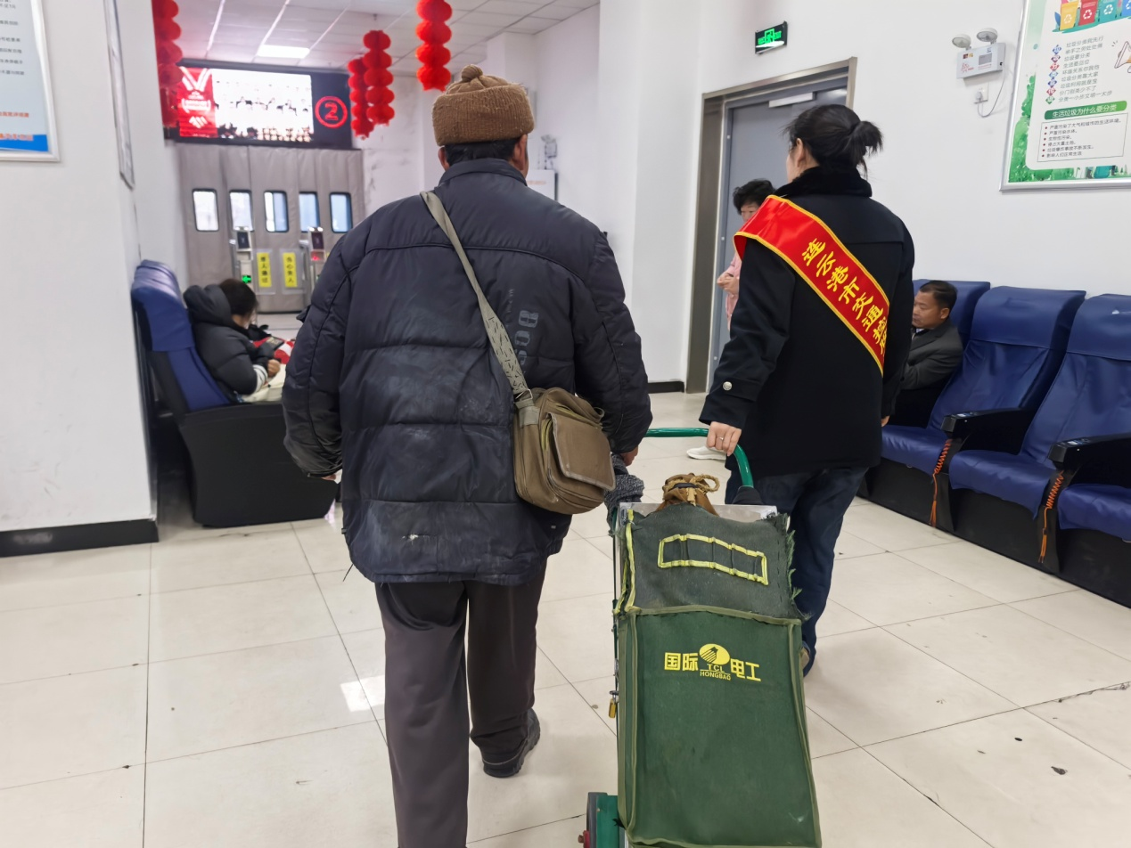 春運(yùn)期間,這股暖流在事業(yè)部候車大廳里涌動不息。2月17日,“雷鋒車”手張孟玲像往常一樣在人群中主動巡查服務(wù),她敏銳地注意到攜帶沉重行李、行動不便的老年旅客后,第一時間上前搭手幫扶,協(xié)助搬運(yùn)箱包、推送行李車,全程引導(dǎo)老人完成安檢、進(jìn)站等全流程。從接過行李、協(xié)助安檢到護(hù)送進(jìn)站,每一個環(huán)節(jié)都細(xì)致周到,盡顯責(zé)任與溫情??粗先似桨岔樌靥ど下猛荆瑥埫狭崮樕下冻鲂牢康男θ荩骸澳軒屠先藗冚p松一點(diǎn)、安心一點(diǎn),就是我們最大的滿足?!?/span>