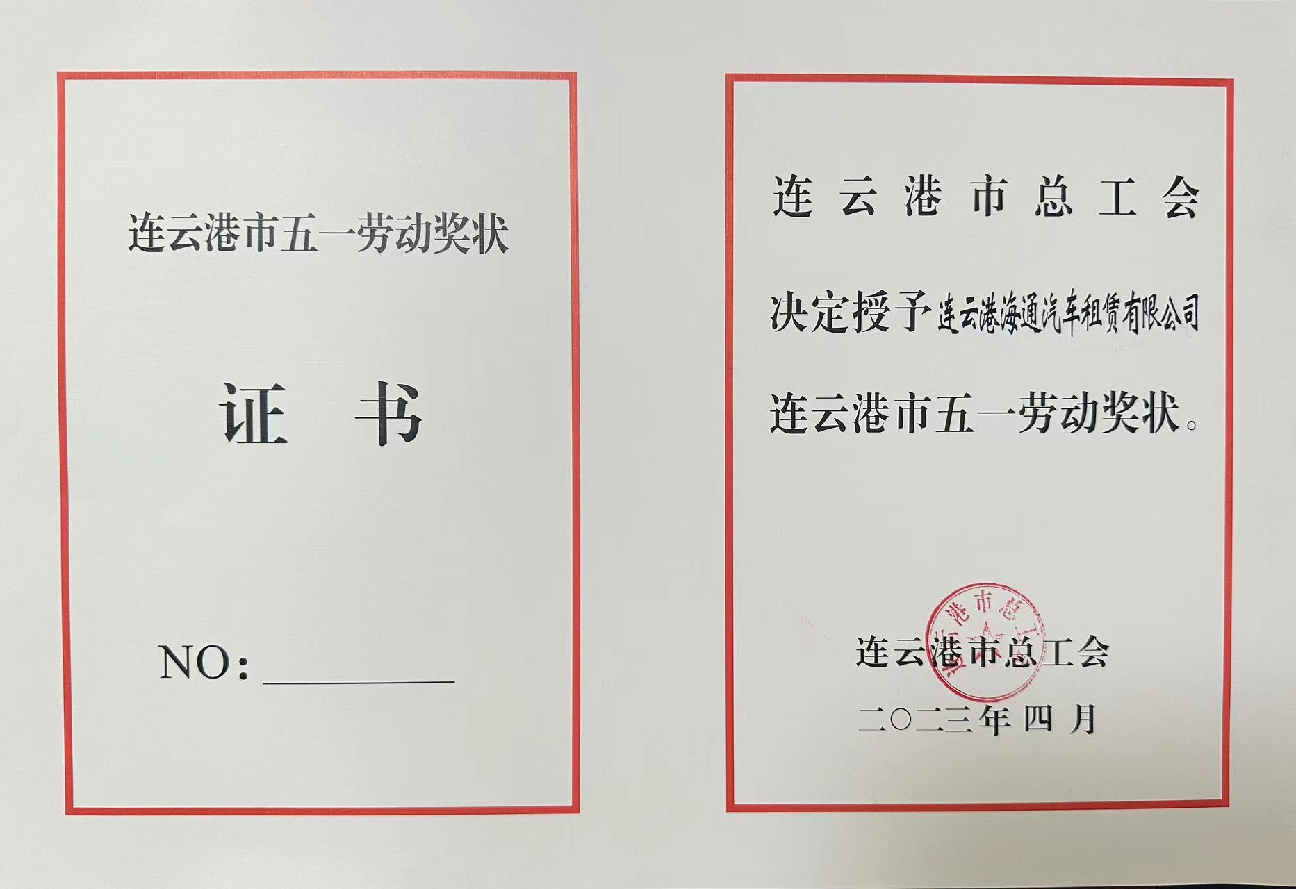 日前,從連云港市總工會(huì)傳來(lái)喜訊,連云港海通汽車租賃有限公司榮獲“連云港市五一勞動(dòng)獎(jiǎng)狀”榮譽(yù)稱號(hào)。