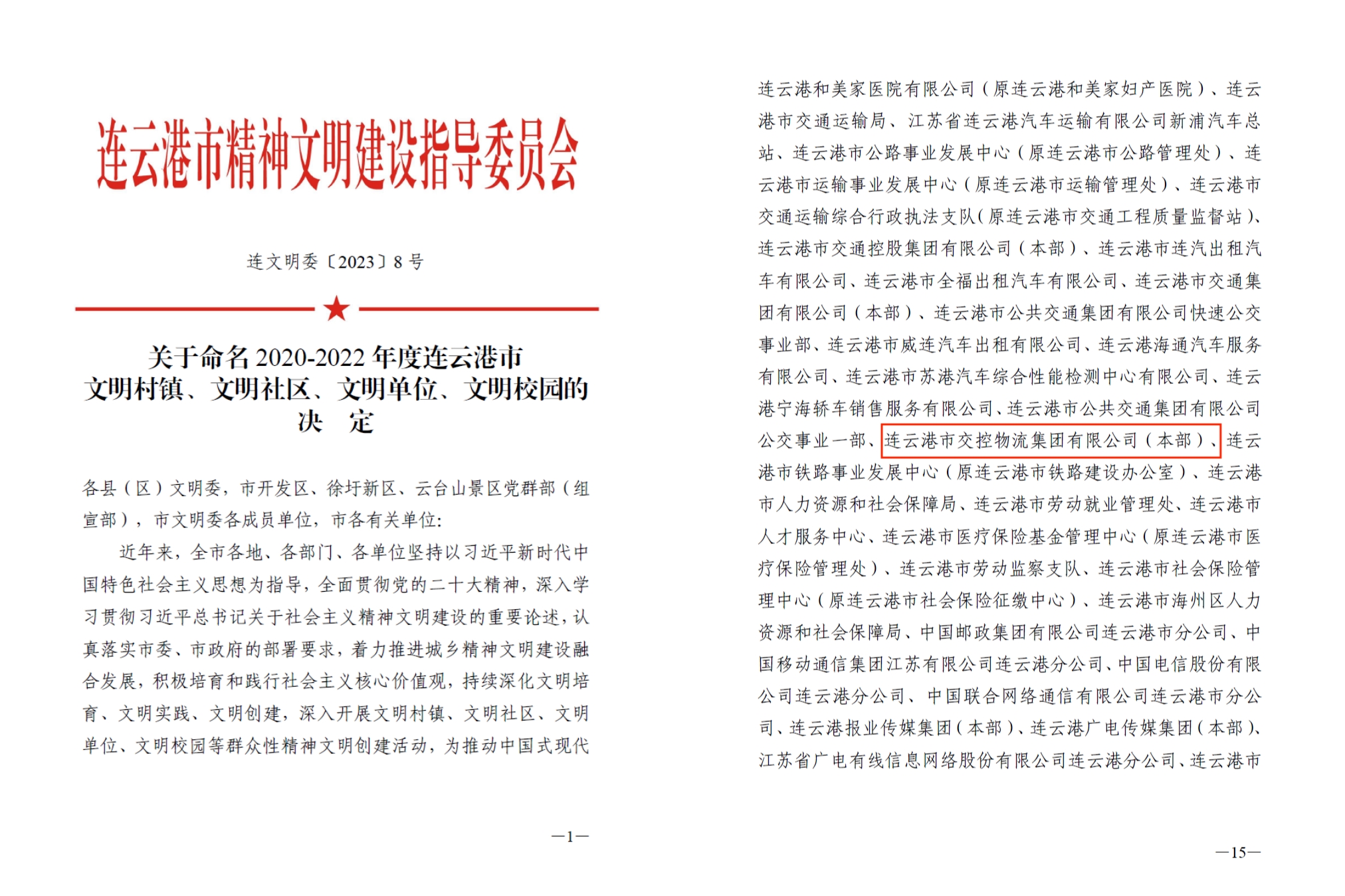 經(jīng)申報(bào)、網(wǎng)上審核、現(xiàn)場審查等一系列流程,物流集團(tuán)順利通過了2020-2022年度連云港市文明單位測評(píng),并于12月27日收到由連云港市精神文明建設(shè)指導(dǎo)委員會(huì)印發(fā)的《連文明委〔2023〕8號(hào)《關(guān)于命名2020-2022年度連云港市文明單位的決定》》文件。