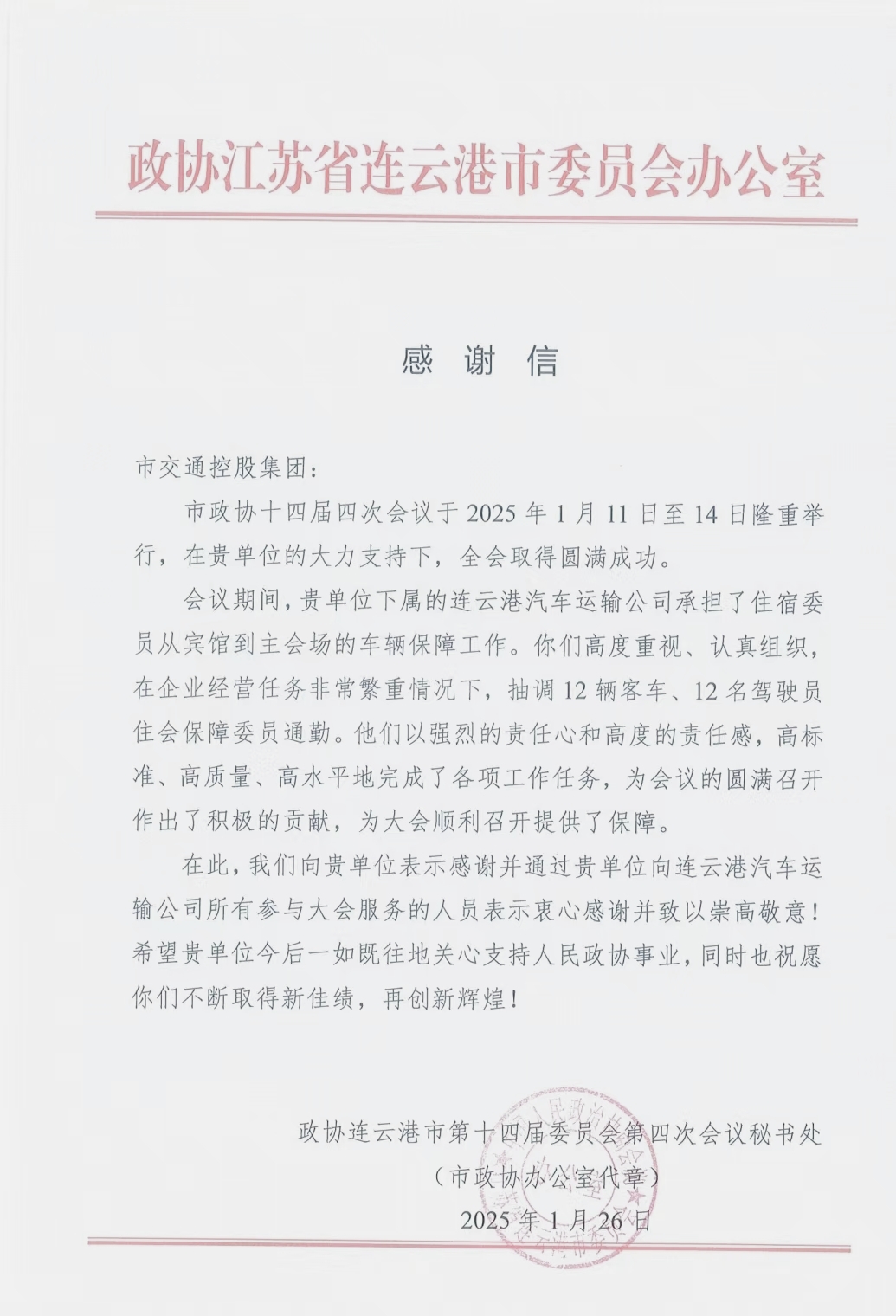 政協(xié)連云港市第十四屆委員會第四次會議秘書處在感謝信中,不僅向市交通控股集團(tuán)所屬的連云港汽車運輸有限公司表達(dá)誠摯謝意,還向所有參與服務(wù)的人員致以崇高敬意。
