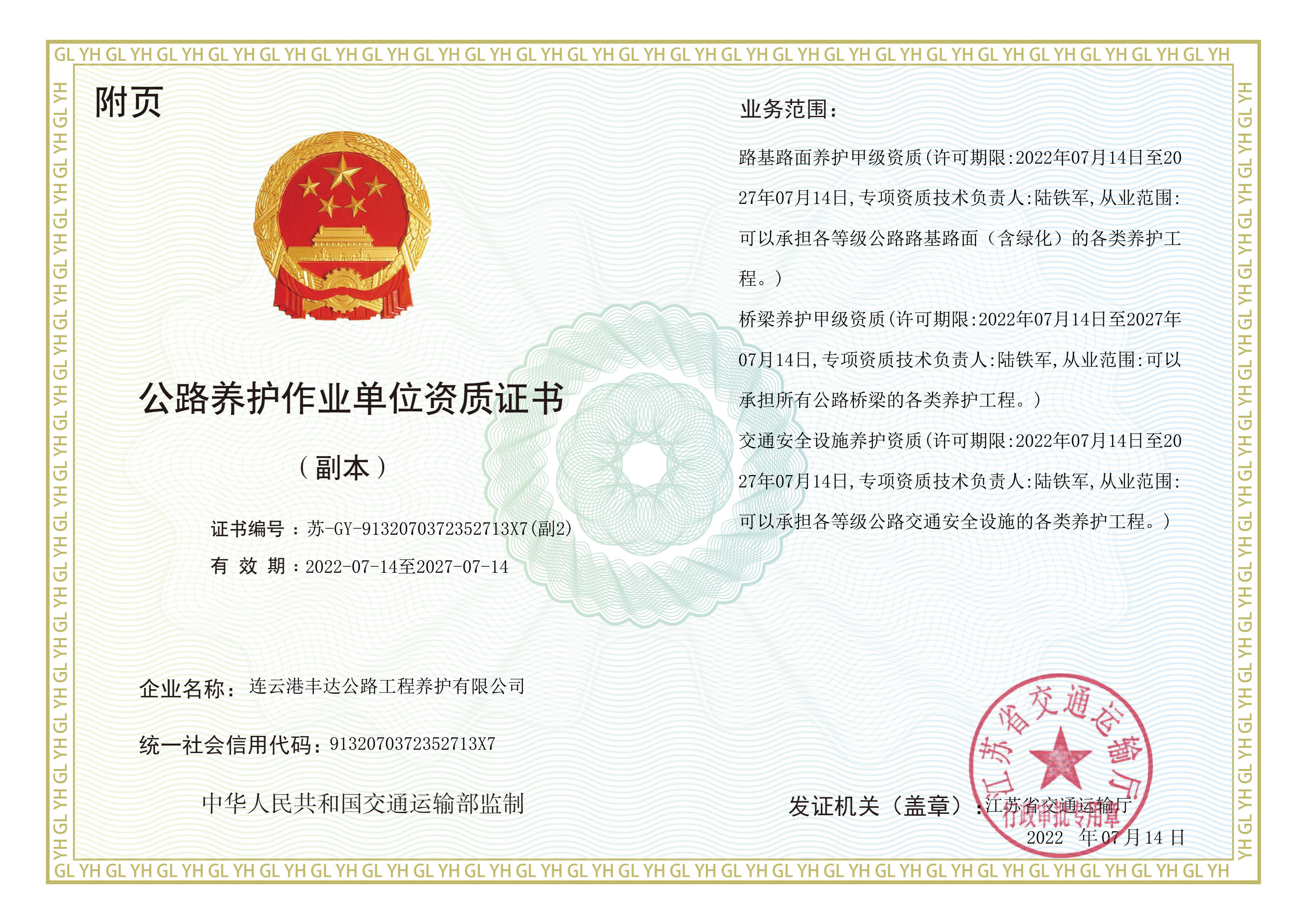 本次新取得的三項(xiàng)資質(zhì)證書(shū),為豐達(dá)公司繼續(xù)立足公路養(yǎng)護(hù)市場(chǎng)奠定基礎(chǔ),也意味著可以拓展更加廣闊的公路養(yǎng)護(hù)市場(chǎng)領(lǐng)域。
